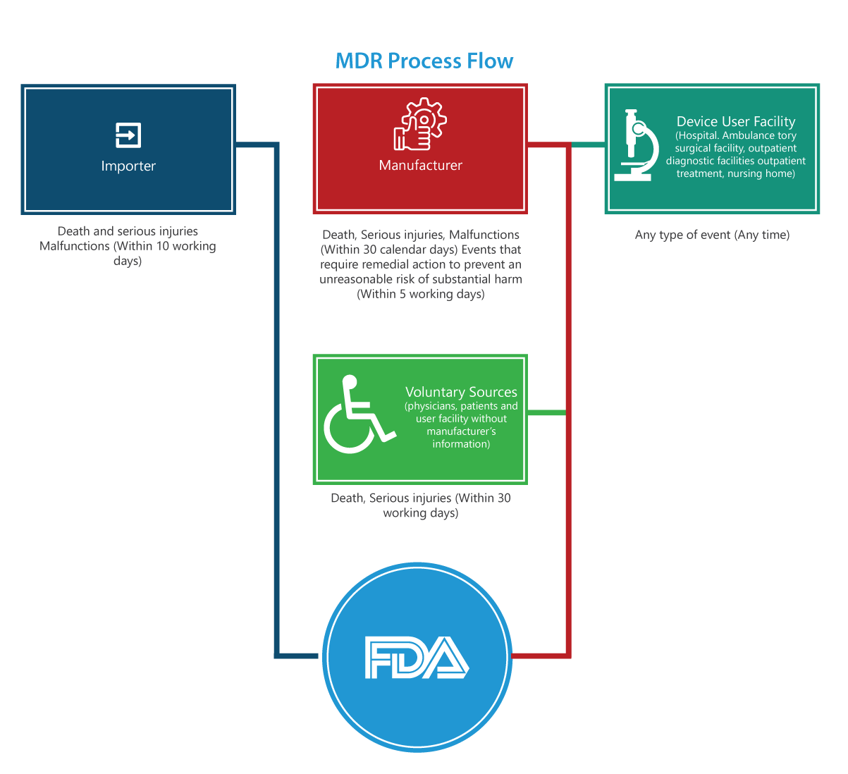 The MDR regulation contains many mandatory requirements for manufacturers, importers, and device user facilities to report certain device-related adverse events and product problems to the FDA. The below provided process flowchart details the reporting process step-by-step.