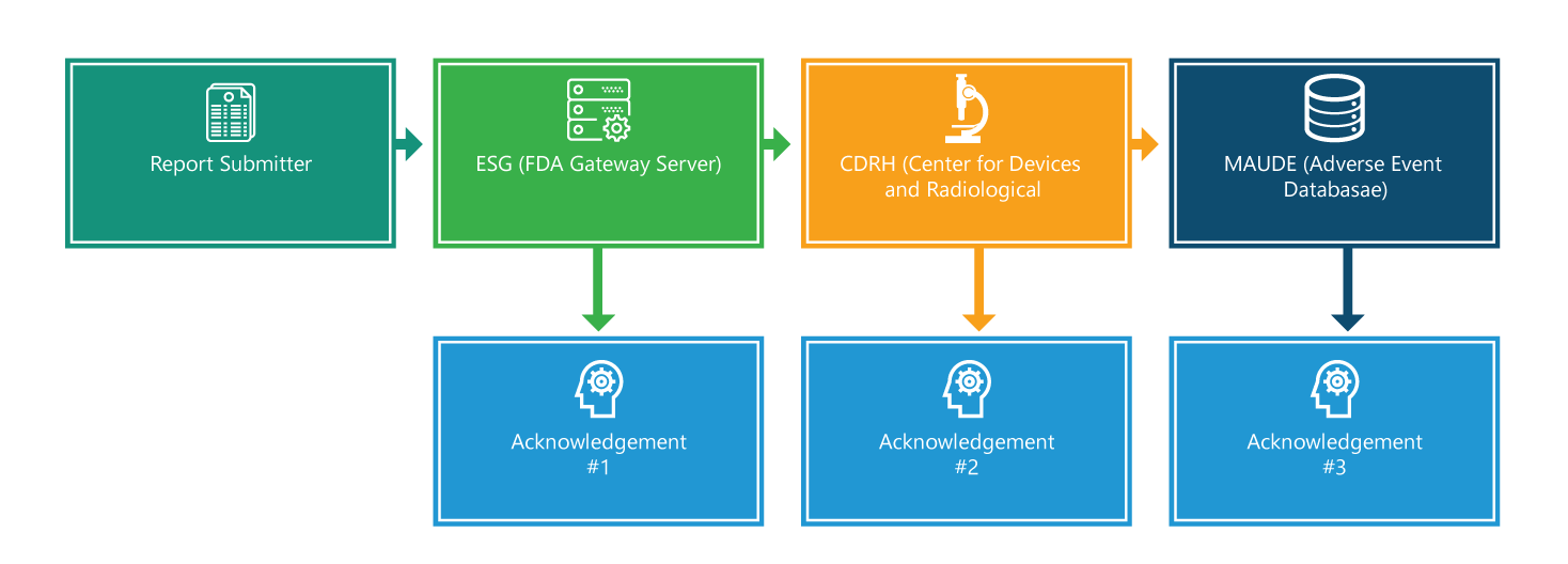 eMDR is automatically routed from the ESG to the Center for Devices and Radiological Health (CDRH). Once it is routed, like in the step 2, you should receive an acknowledgment, i.e., #2.
